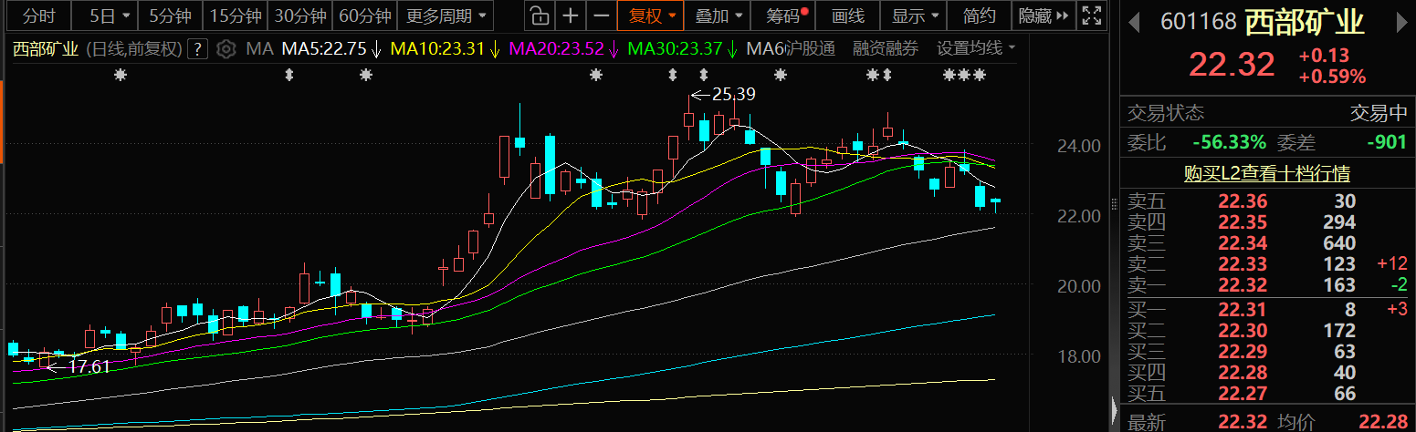 11月24日,西部矿业的股价出现上涨,截至24日10:20分,西部矿业涨0.59%,报22.32元/股。