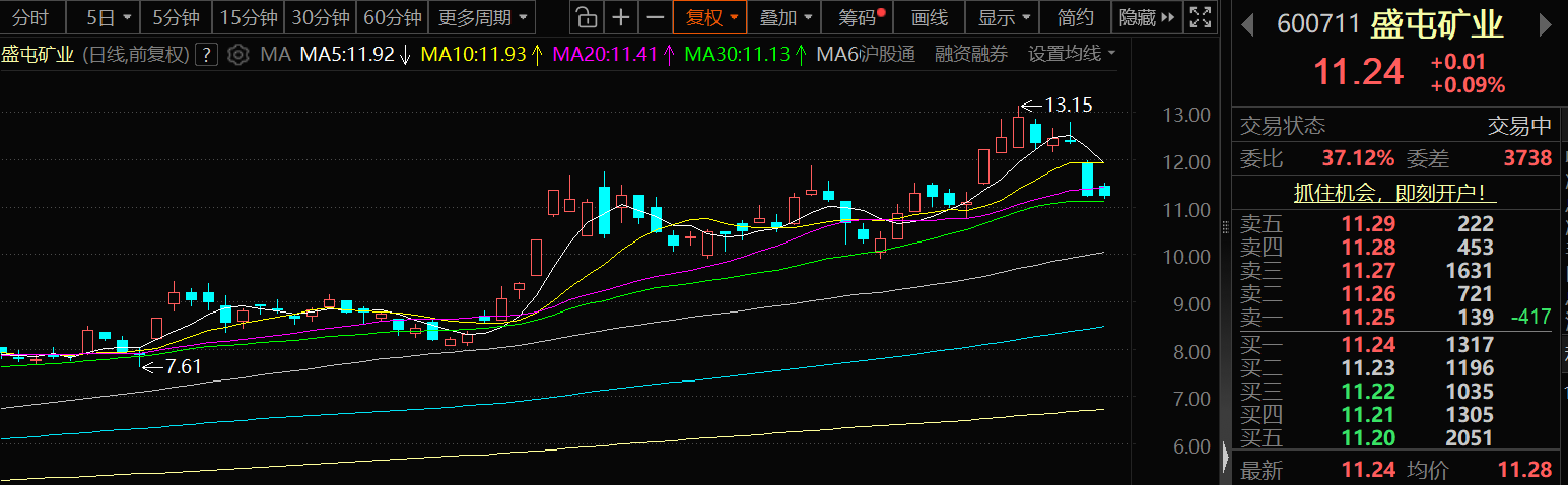 11月24日,盛屯矿业股价出现上涨,截至24日10:46分,盛屯矿业涨0.09%,报11.24元/股。