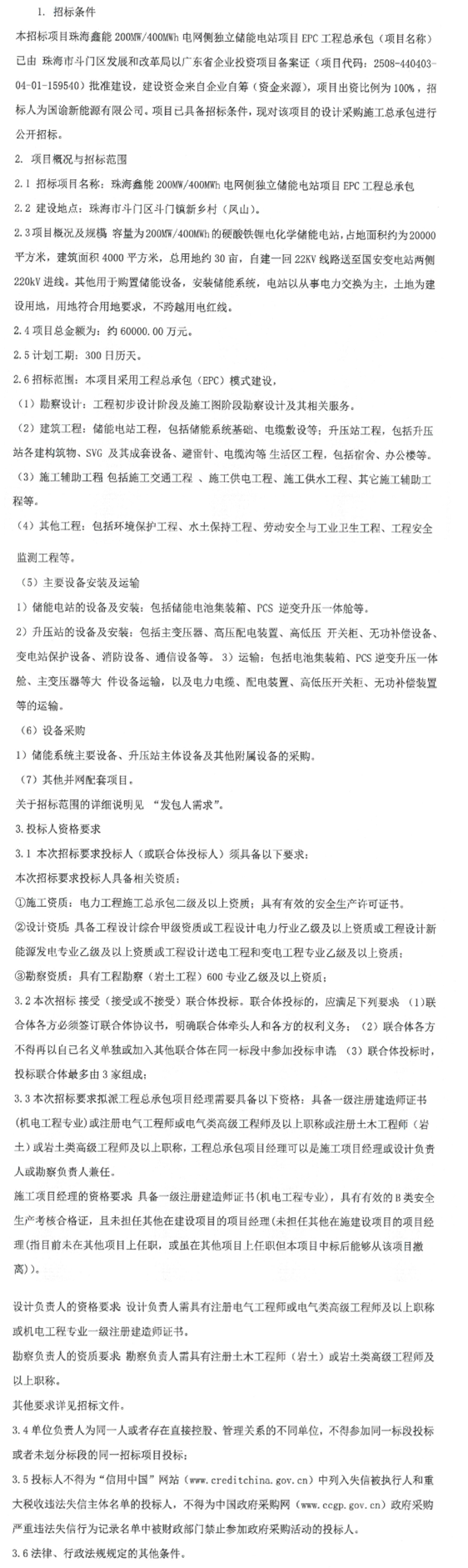 11月22日,珠海鑫能200MW/400MWh电网侧独立储能电站项目EPC工程总承包招标公告发布。项目招标人为国谕新能源有限公司,项目位于广东省珠海市斗门区,建设容量为200MW/400MWh的磷酸铁锂电化学储能电站,占地面积约为20000平方米,建筑面积 4000平方米,总用地约 30亩,自建一回 22KV 线路送至国安变电站两侧 220kV进线。其他用于购置储能设备,安装储能系统,电站以从事电力交换为主,土地为建设用地用地符合用地要求,不跨越用电红线。
