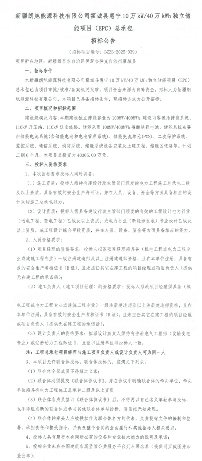 11月21日,新疆朗旭能源科技有限公司霍城县惠宁10万kW/40万kWh独立储能项目(EPC)总承包招标公告发布,项目招标人为新疆朗旭能源科技有限公司,项目位于新疆维吾尔自治区伊犁哈萨克自治州霍城县,本期建设独立储能容量为100MW/400MWh,建设内容包括储能系统110kV 升压站、110kV 送出线路。