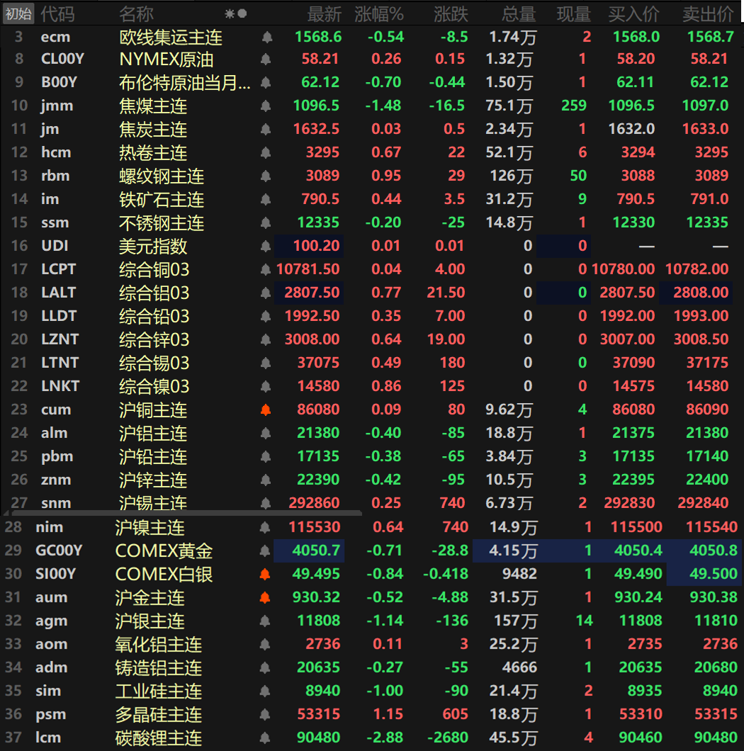 此外,碳酸锂主连跌2.88%,多晶硅主连涨1.15%,工业硅主连跌1%。欧线集运主连跌0.54%报1568.6。