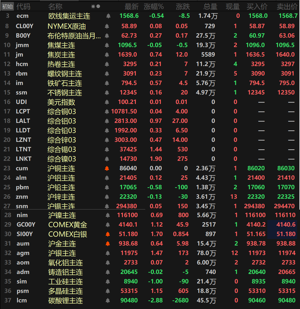 隔夜内外盘金属普涨,仅沪铅和沪锌一同下跌,沪铅跌0.58%,沪锌跌0.13%。沪铜暂时持平于86040元/吨。外盘伦锡和伦镍一同涨逾1%,伦锡涨1.44%,伦镍涨1.9%。其余金属涨幅均在1%以内。氧化铝主连涨0.07%,铸造铝主连跌0.02%。