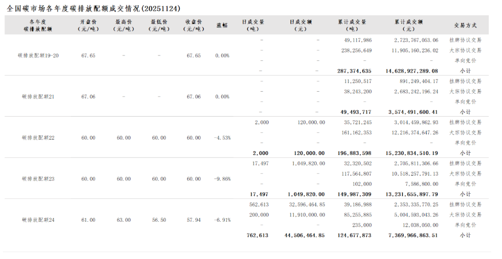 截至2025年11月24日,全国碳市场碳排放配额累计成交量808,417,132吨,累计成交额54,035,876,160.98元。