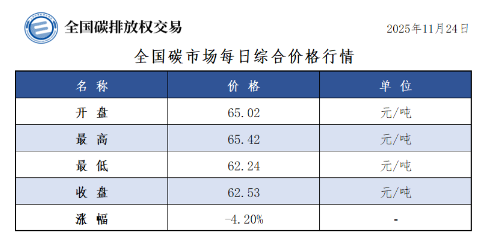 今日全国碳市场综合价格行情为: 开盘价65.02元/吨,最高价65.42元/吨,最低价62.24元/吨,收盘价62.53元/吨,收盘价较前一日下跌4.20%。