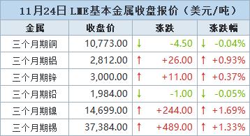 伦敦时间11月24日17:00(北京时间11月25日01:00),LME三个月期铜下跌4.5美元,或0.04%,收报每吨10,773.0美元。10月29日一度触及11,200美元的历史新高,因对供应和短缺的担忧加剧。