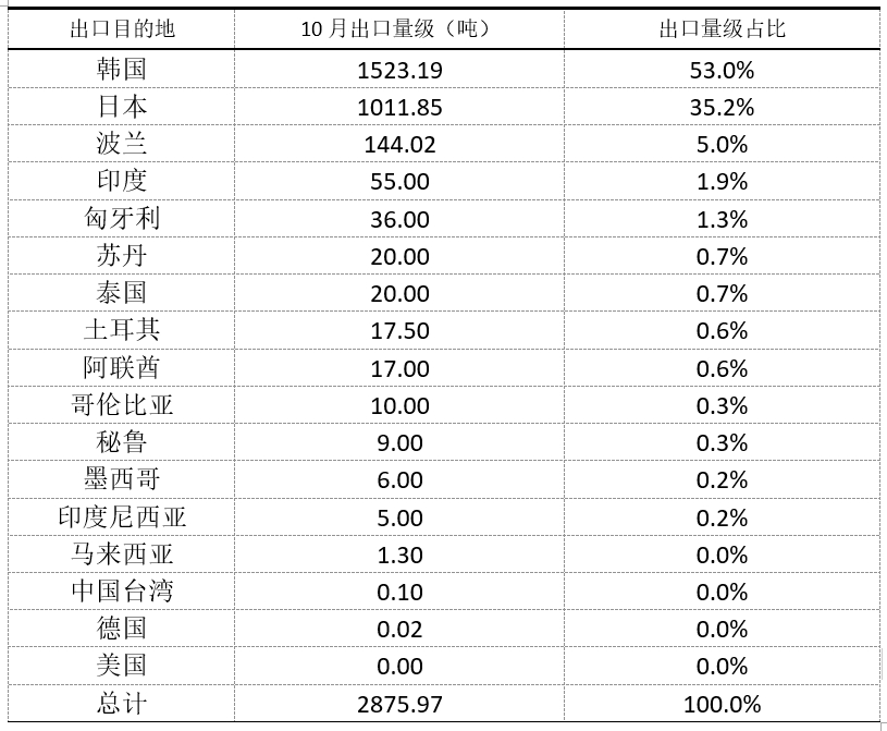 据海关数据显示,2025年10月中国氢氧化锂出口量级2876吨,环比上月减少56%,同比减少63%。分国别来看,出口往韩国与日本占比总出口量88%:往韩国出口量级1523吨,环比9月减少67%,同比减少74%;往日本出口量级1012吨,环比9月减少41%,同比减量40%。