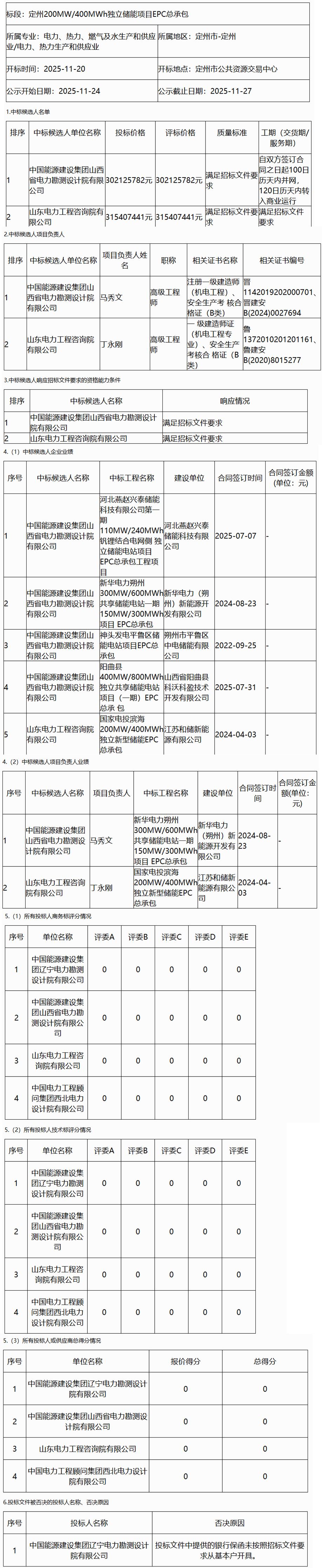 北极星储能网获悉,11月24日,定州200MW/400MWh独立储能项目EPC总承包中标候选人公示。