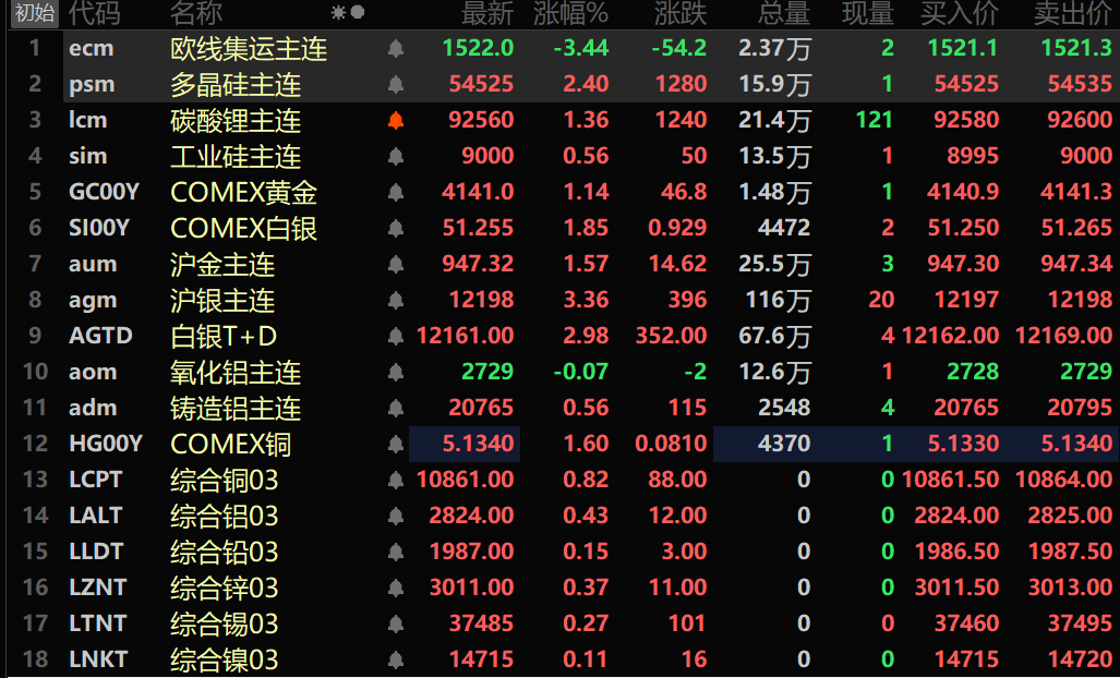 此外,铸造铝主连期货涨0.56%,氧化铝主连跌0.07%。碳酸锂主连涨1.36%。工业硅主连涨0.56%。多晶硅主连延续前一个交易日的涨势继续涨2.4%。