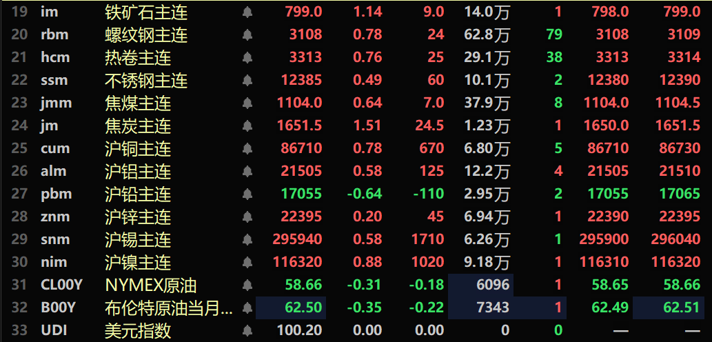 黑色系均飘红,铁矿涨1.14%,螺纹涨0.78%,热卷涨0.76%,不锈钢涨0.49%。双焦方面:焦煤主力合约涨0.64%,焦炭主力合约涨1.51%。