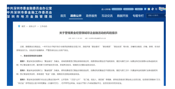 11月24日,深圳市委金融委员会办公室发布《关于警惕黄金经营领域非法金融活动的风险提示》(以下简称《风险提示》)。