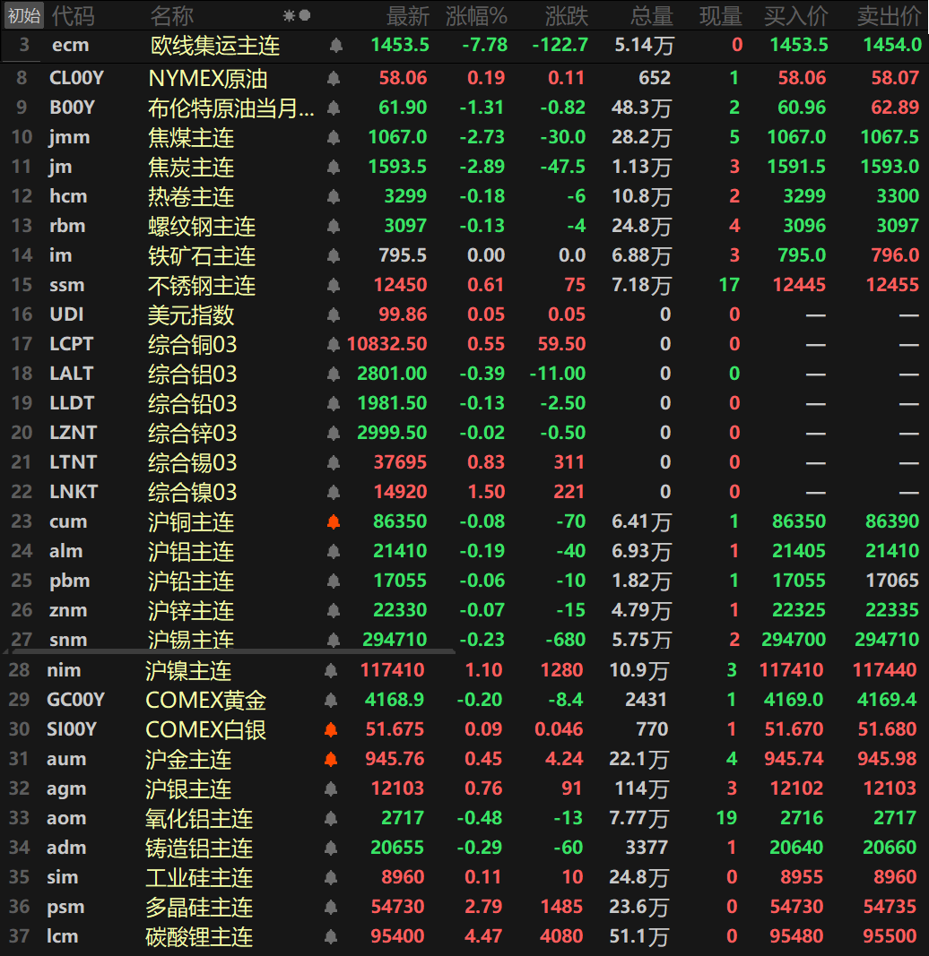隔夜黑色系方面多飘绿,不锈钢涨0.61%,铁矿暂时持平于795.5元/吨,热卷、螺纹仅小幅下跌。双焦方面,焦煤跌2.73%,焦炭跌2.89%。