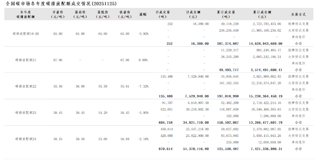 2025年1月1日至11月25日,全国碳市场碳排放配额成交量179,759,492吨,成交额11,096,887,204.27元。