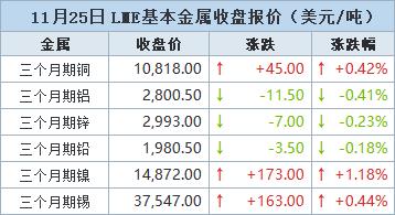 伦敦时间11月25日17:00(北京时间11月26日01:00),LME三个月期铜上涨45美元,或0.42%,收报每吨10,818.0美元;此前曾触及10,949美元,为11月13日以来最高。
