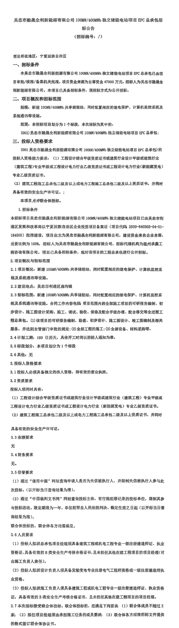 11月25日,吴忠市融晟全利新能源有限公司100MW/400MWh独立储能电站项目EPC总承包招标公告发布。项目业主和招标人为吴忠市融晟全利新能源有限公司,项目位于宁夏吴忠,项目新建100MW/400MWh共享储能站,同时配置相应的继电保护、计算机监控系统及系统通讯等设施。