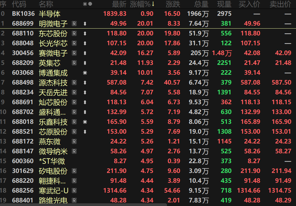 SMM 11月26日讯:自11月24日以来,半导体板块接连走高,11月26日,其盘中再度走高,指数涨逾1%。个股方面,明微电子、东芯股份、长光华芯20CM涨停,博通集成涨10.01%封死涨停板,天岳先进、源杰科技、灿芯股份等多股纷纷跟涨。