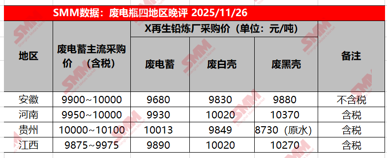 目前废电动的主流含税价格在9900-10050元/吨。系年底临近,废旧铅酸蓄电池回收企业为回款,出货积极性向好;华中、华东、华北地区多数铅冶炼厂表示近期原料到货量较好。西南、西北地区铅冶炼企业表示采购压力仍存,企业间存在价格竞争现象。