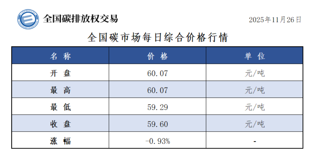 今日全国碳市场综合价格行情为: 开盘价60.07元/吨,最高价60.07元/吨,最低价59.29元/吨,收盘价59.60元/吨,收盘价较前一日下跌0.93%。