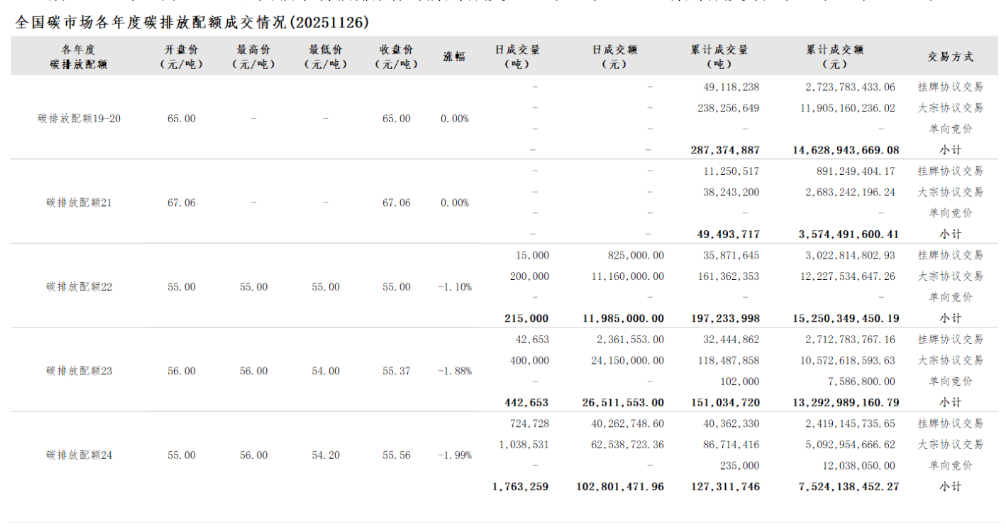 截至2025年11月26日,全国碳市场碳排放配额累计成交量812,449,068吨,累计成交额54,270,912,332.74元。