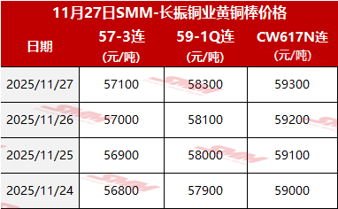 【SMM价格】2025年11月27日长振黄铜棒价格