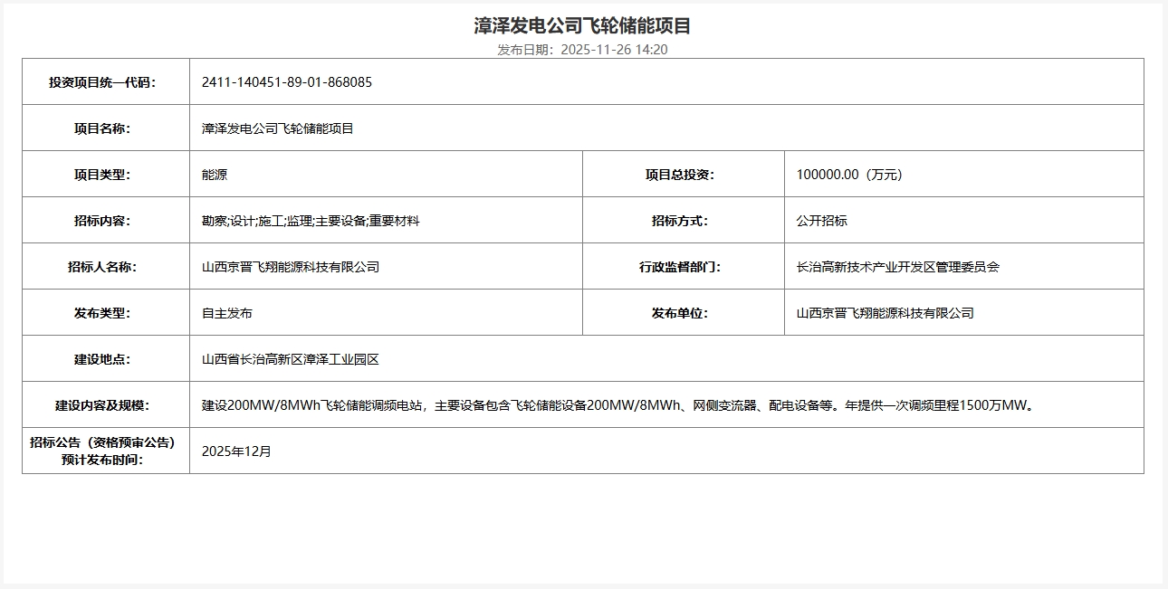11月26日,漳泽发电公司飞轮储能项目对外发布相关信息,该项目招标人为山西京晋飞鹏能源科技有限公司。