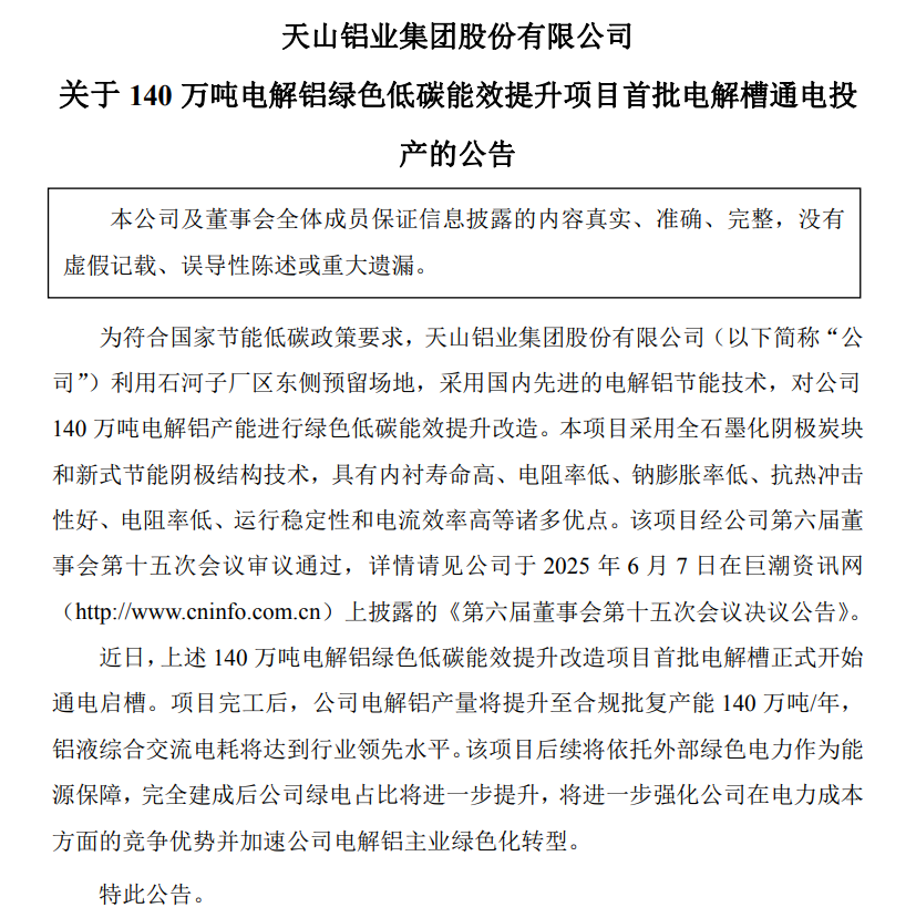 据悉,为符合国家节能低碳政策要求,天山铝业在6月7日发布公告称,同意公司利用石河子厂区东侧预留场地,采用国内先进的电解铝节能技术,对公司140万吨电解铝产能进行绿色低碳能效提升改造。据悉,本项目采用全石墨化阴极炭块和新式节能阴极结构技术,具有内衬寿命高、电阻率低、钠膨胀率低、抗热冲击性好、电阻率低、运行稳定性和电流效率高等诸多优点。