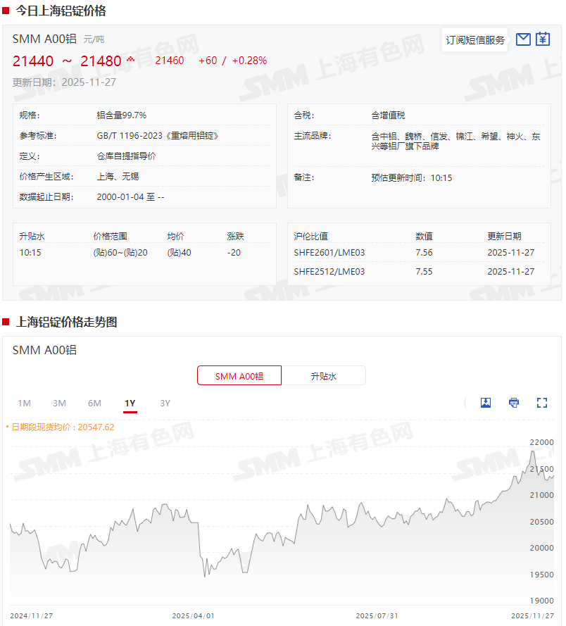 进入11月,国内汽车年底冲量及铝水长单执行给予电解铝需求支撑,铝锭社会库存预期去化,基本面表现给予铝价强支撑。宏观利好及伦铝价格上行给予铝价重心上移动力,截至11月27日,SMM A00铝现货报价涨至21440~21480元/吨,均价报21460元/吨。
