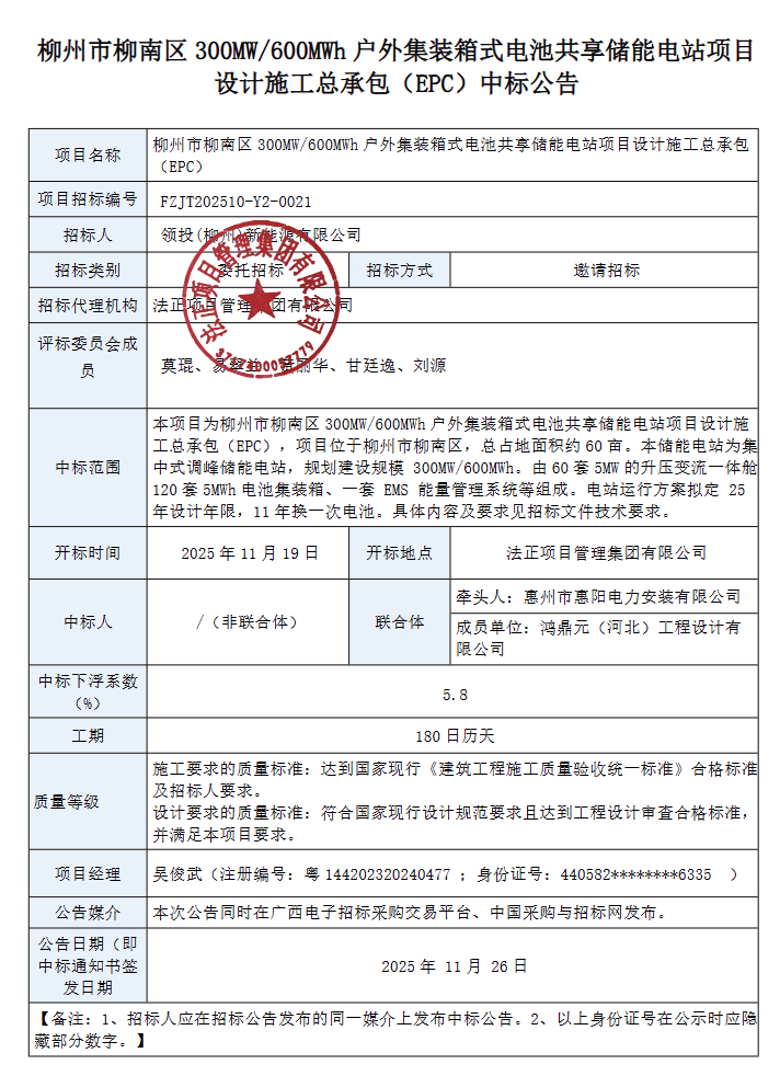 11月26日,柳州市柳南区300MW/600MWh户外集装箱式电池共享储能电站项目设计施工总承包(EPC)中标公告发布。惠州市惠阳电力安装有限公司和鸿鼎元(河北)工程设计有限公司联合体中标,中标下浮系数为5.8%,本项目预算控制价为84000万元,相当于投标报价79128万元,折合单价1.3188元/Wh。