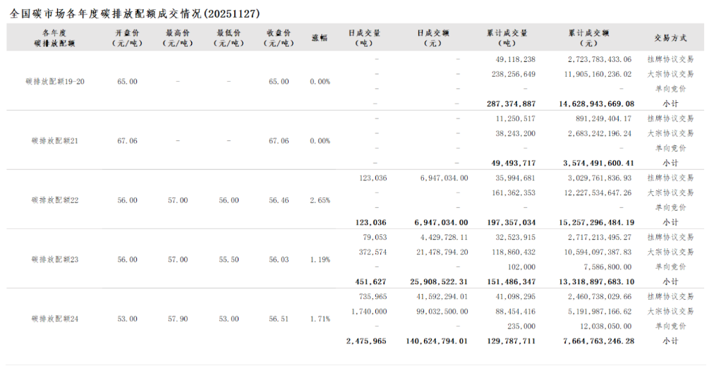 2025年1月1日至11月27日,全国碳市场碳排放配额成交量185,231,032吨,成交额11,411,665,579.55元。