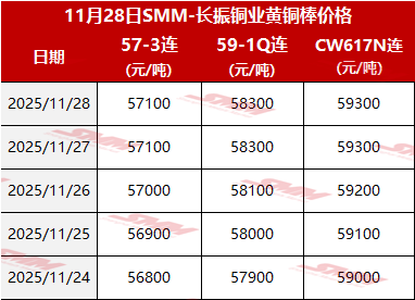 【SMM价格】2025年11月28日长振黄铜棒价格