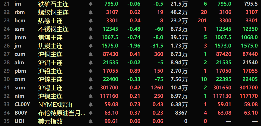 此外,铸造铝主连期货微跌,氧化铝主连涨0.11%。碳酸锂主连微涨。工业硅主连涨0.55%。多晶硅主连跌0.14%。