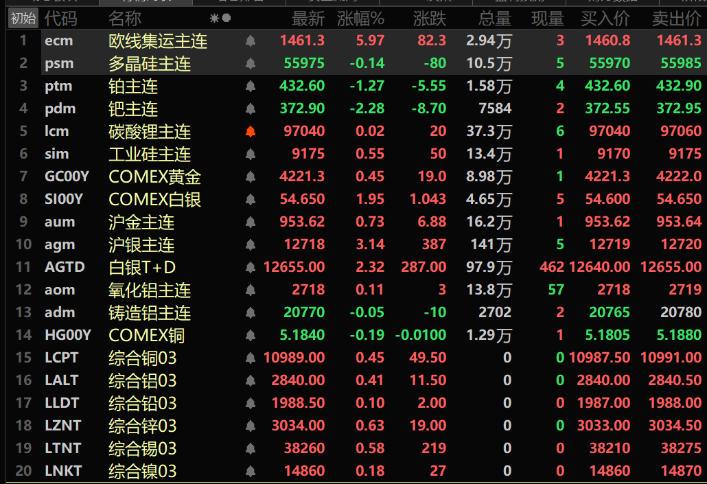 截至午间收盘,欧线集运主力合约涨5.97%,报1461.3点。