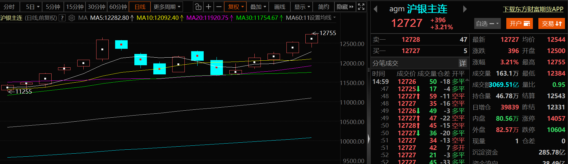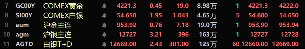 市场对美联储下月降息的押注持续升温,根据芝商所(CME)的FedWatch工具,美国利率期货对12月降息可能性的定价为87%,前一天为85%。值得注意的是,芝商所发布通知称,因技术问题,芝加哥商品交易所(CME)Globex期货和期权暂停交易,技术团队正全力抢修,开盘前相关安排将第一时间告知客户。与此同时,白银自身供需缺口扩大、库存处于低位,叠加光伏、AI、新能源汽车等领域带来的工业需求结构性增长,基本面利好持续发酵;而在黄金价格高企的背景下,部分投资资金转向性价比更高的白银,推动白银投资需求激增。此外,地缘政治局势的反复,进一步为贵金属行情提供了支撑,多重因素共振推动贵金属期股联袂上涨。截至11月28日18:04分左右,COMEX黄金涨0.45%,报4221.3美元/盎司;沪金主连涨0.61%,报952.52元/克;COMEX白银涨1.95%,刷新历史新高至54.65美元/盎司;沪银主连涨3.21%,报12727元/千克,盘中刷新历史新高至12755元/千克;白银T+D涨2.43%,报12669元/千克,盘中刷新历史新高至12707元/千克。