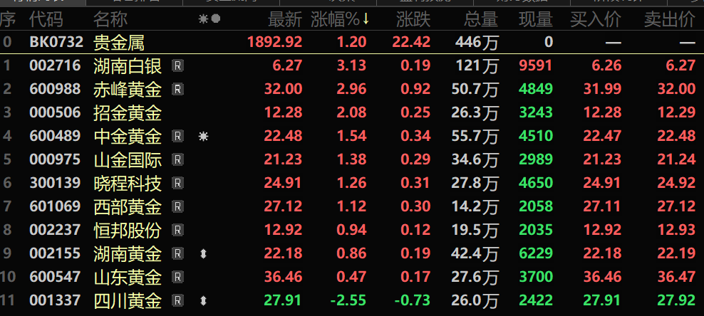 股市方面,截至11月28日收盘,贵金属板块涨1.2%,个股方面:湖南白银涨超3%,赤峰黄金、招金黄金、中金黄金以及山金国际等涨幅居前。