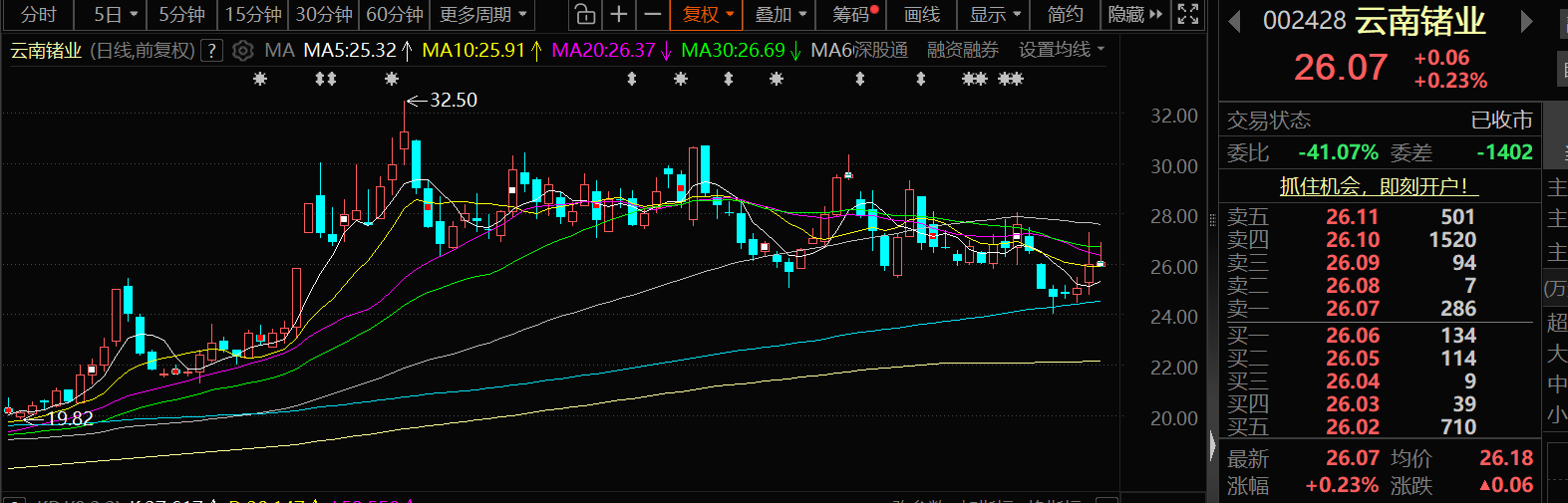 11月28日,云南锗业延续前三个交易日的涨势继续上涨,截至28日收盘,云南锗业涨0.23%,报26.07元/股。