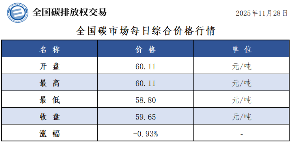 今日全国碳市场综合价格行情为: 开盘价60.11元/吨,最高价60.11元/吨,最低价58.80元/吨,收盘价59.65元/吨,收盘价较前一日下跌0.93%。