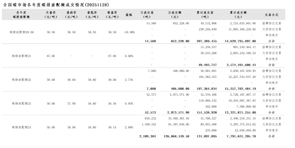 2025年1月1日至11月28日,全国碳市场碳排放配额成交量187,414,557吨,成交额11,542,765,528.95元。