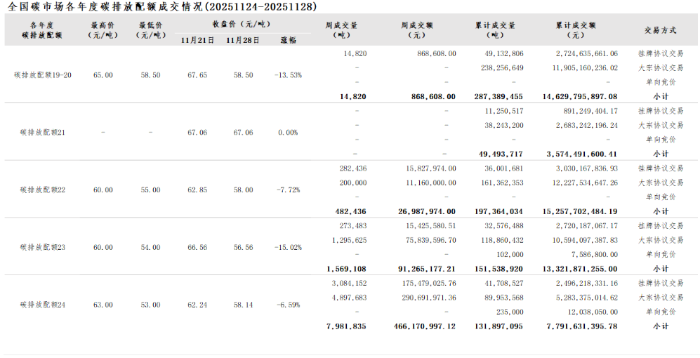 截至2025年11月28日,全国碳市场碳排放配额累计成交量817,683,221吨,累计成交额54,575,492,632.46元。