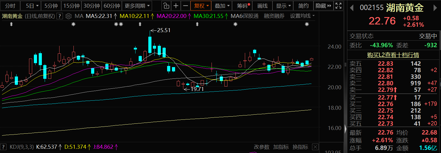 12月1日,湖南黄金的股价出现上涨,截至1日9:32分,湖南黄金涨2.61%,报22.76元/股。