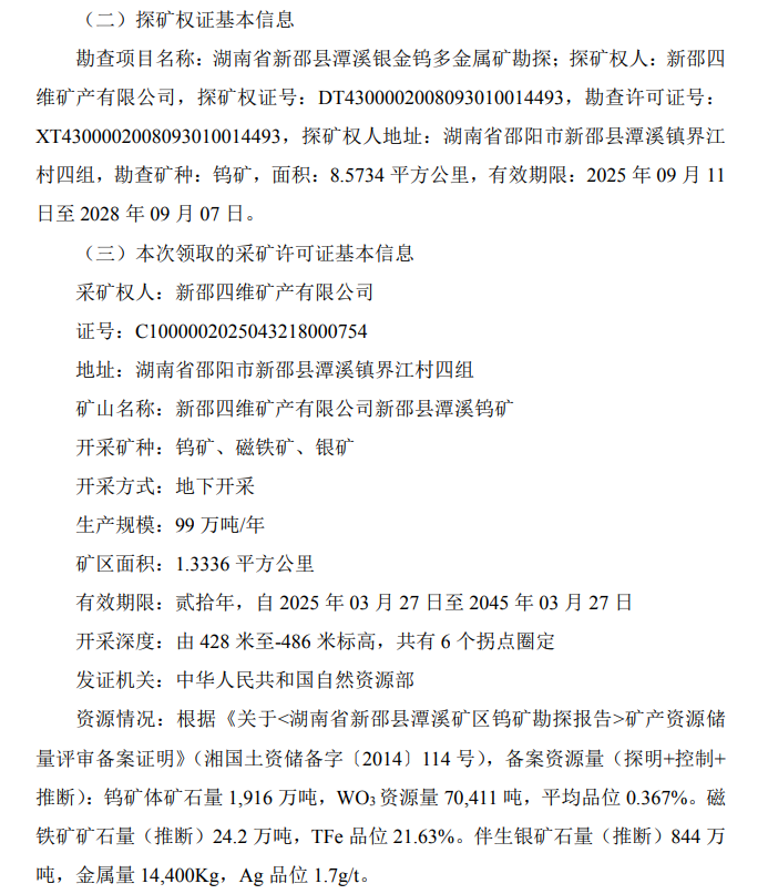 湖南黄金公告的资源情况和其他显示:根据《关于矿产资源储量评审备案证明》(湘国土资储备字〔2014〕114 号),备案资源量(探明+控制+推断):钨矿体矿石量 1,916 万吨,WO3资源量 70,411 吨,平均品位0.367%。磁铁矿矿石量(推断)24.2 万吨,TFe 品位 21.63%。伴生银矿石量(推断)844万吨,金属量 14,400Kg,Ag 品位 1.7g/t。 其他:根据《自然资源部关于进一步完善矿产资源勘查开采登记管理的通知》(自然资规〔2023〕4 号)“探矿权转采矿权的,准予采矿权新立登记后,应当注销原探矿权或变更缩减原探矿权面积,申请人凭注销通知(证明)或变更缩减面积后的勘查许可证领取采矿许可证”,新邵四维完成湖南省新邵县潭溪银金钨多金属探矿权变更(缩减勘查范围)后于 2025 年 11 月27 日领取新邵县潭溪钨矿采矿许可证。
