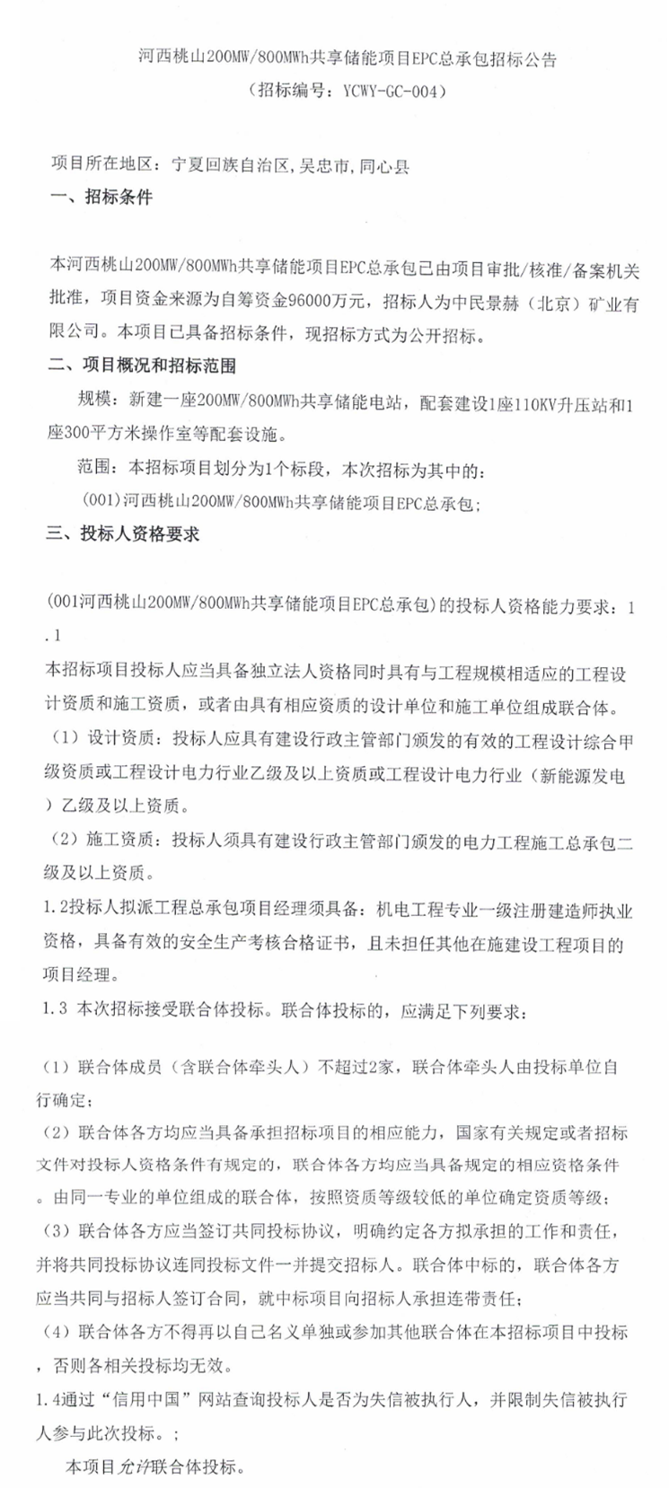 北极星储能网讯:2025年11月28日,中民景赫(北京)矿业有限公司发布招标公告,新建一座200MW/800MWh共享储能电站,配套建设1座110KV升压站和1座300平方米操作室等配套设施。项目资金来源为自筹资金96000万元,单价合1.2元/Wh。项目所在地区为宁夏吴忠市同心县。
