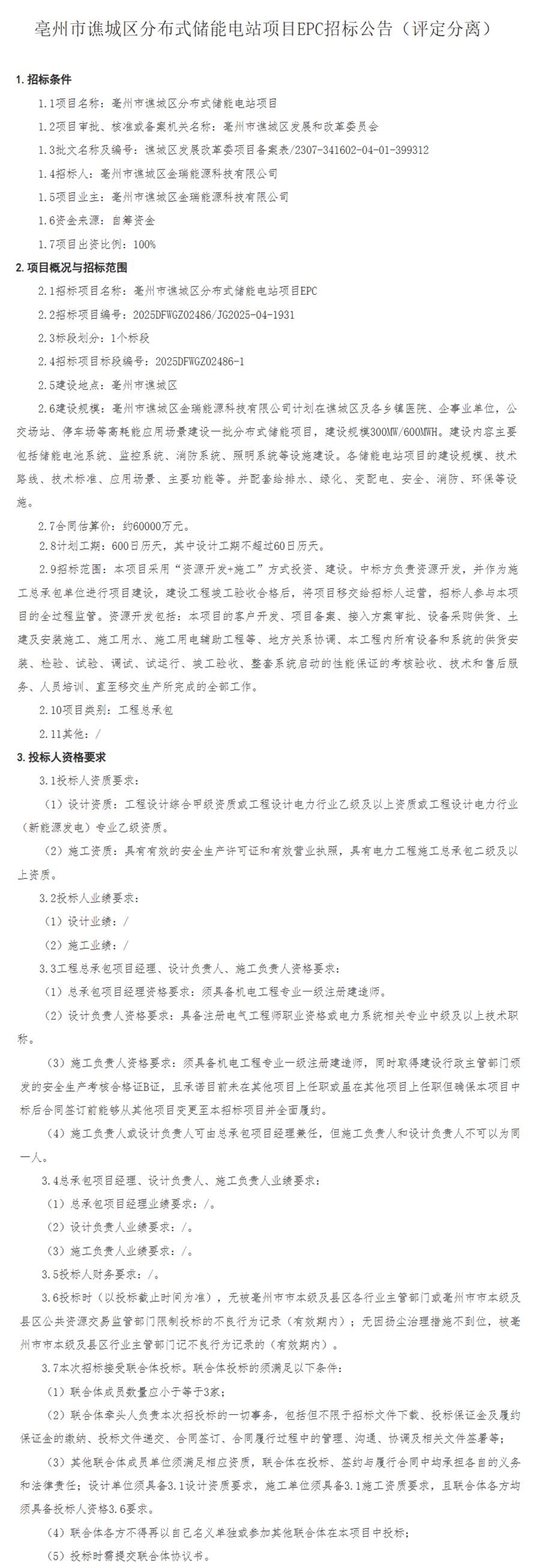11月28日,亳州市谯城区分布式储能电站项目EPC招标公告发布。