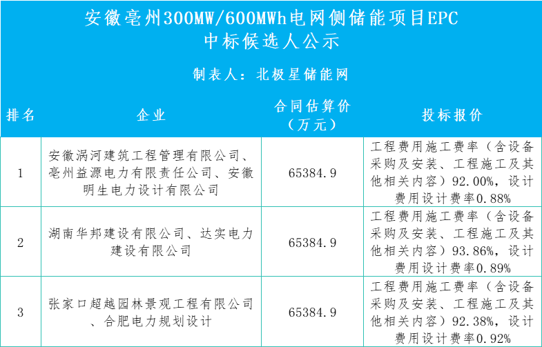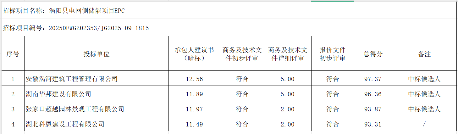 涡阳县电网侧储能项目EPC评标工作已结束,中标候选人结果公示如下(按中标候选人单位名称的拼音首字母排序公示中标候选人,拼音首字母相同的,按第二个字拼音首字母排序,依次类推;所有字拼音首字母相同的按中标候选人提交投标文件时间先后排序):