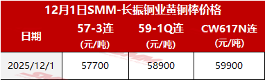 【SMM价格】2025年12月1日长振黄铜棒价格