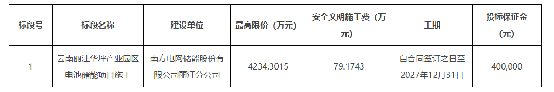 11月28日,南网储能公司云南丽江华坪产业园区电池储能项目施工公开招标项目招标公告发布。
