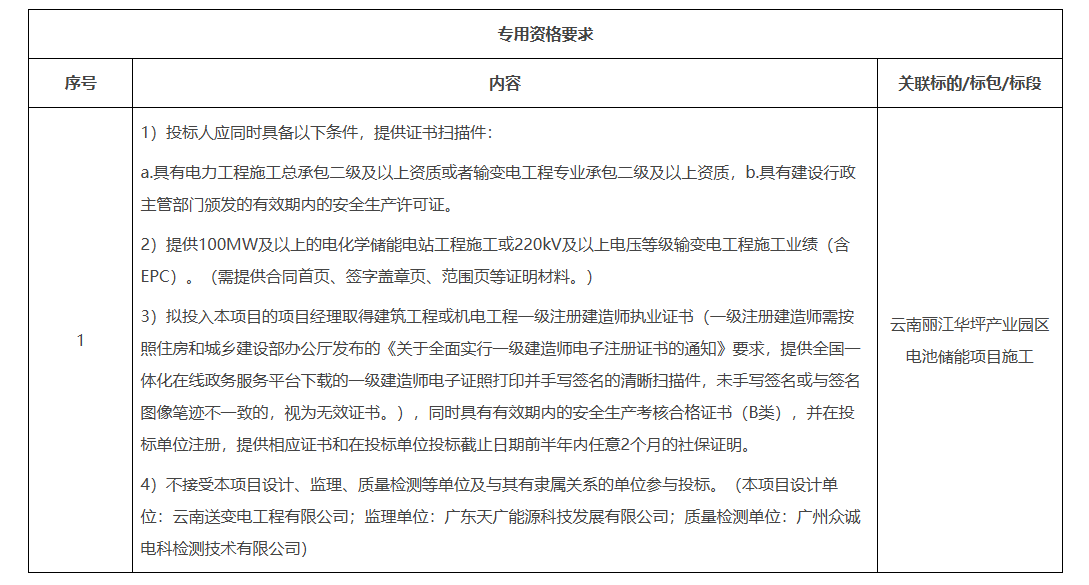 本招标项目南网储能公司云南丽江华坪产业园区电池储能项目施工公开招标项目,招标人为南方电网储能股份有限公司,项目资金来自自筹资金,该项目已具备招标条件,现对本项目进行公开招标。