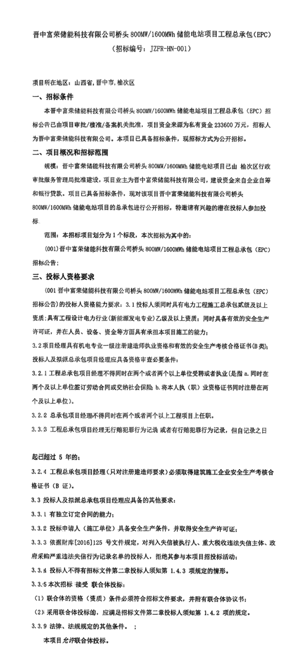 项目划分为1个标段,本次招标为晋中富荣储能科技有限公司桥头800MW/1600MWh储能电站项目工程总承包。