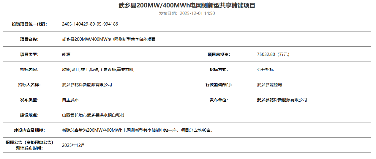 北极星储能网获悉,12月1日,山西武乡县200MW/400MWh电网侧新型共享储能项目即将招标,项目总投资75032.80万元,约合1.876元/Wh,项目位于山西省长治市武乡县洪水镇白和村,新建总容量为200MW/400MWh电网测新型共享储能电站一座,项目总占地40亩。