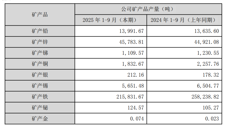 矿产品产量:2025 年 1-9 月,公司生产矿产锡 5,651.48 吨,较上年同期减少13.12%;矿产银 212.16 吨,较上年同期增加 18.98%;矿产锌 45,783.81 吨,较上年同期增加1.92%;矿产铅 13,991.67 吨,较上年同期增加 2.61%;矿产铜1,832.67 吨,较上年同期减少 18.83%;矿产锑 1,109.57 吨,较上年同期减少 9.83%;矿产铁21.58 万吨,较上年同期减少 16.42%。矿产铋 124.57 吨,较上年同期增加 18.33%,矿产金0.074 吨,较上年同期增加 221.74%。