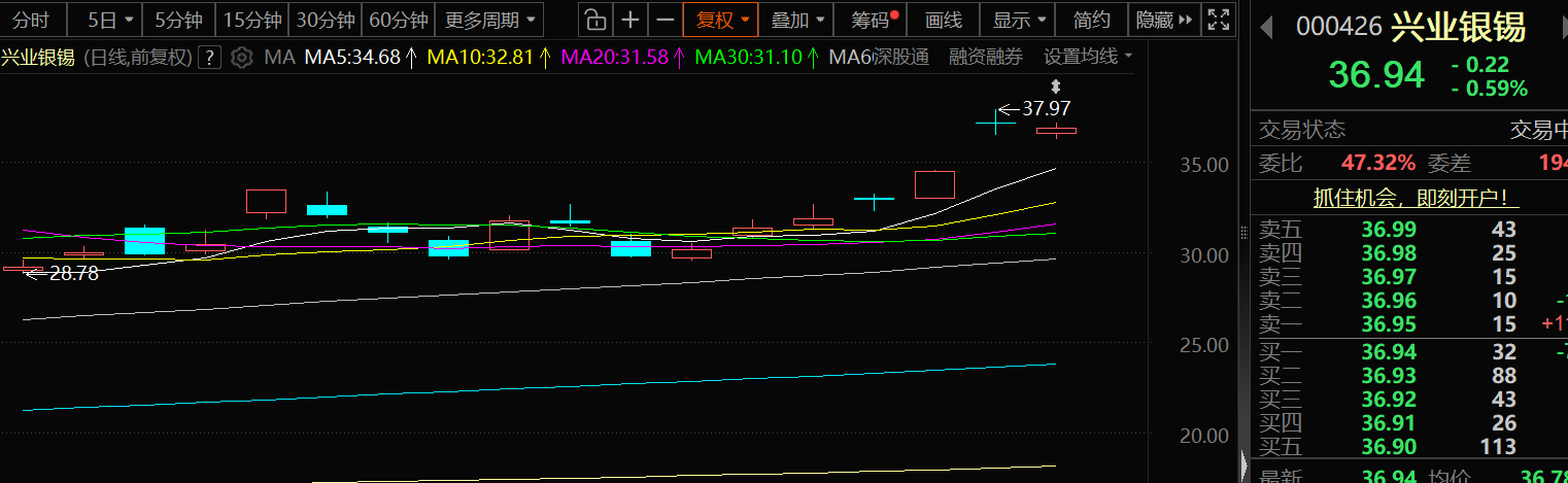 12月2日,兴业银锡的股价告别“六连涨”,出现了小幅下跌,截至12月2日13:19分,兴业银锡跌0.59%,报36.94元/股。