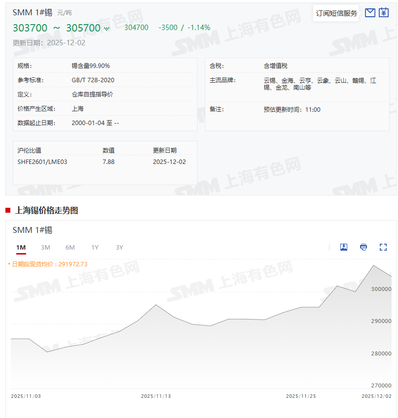 12月2日,SMM1#锡的报价为303700~305700元/吨,其均价为304700元/吨,较前一交易日跌1.14%。